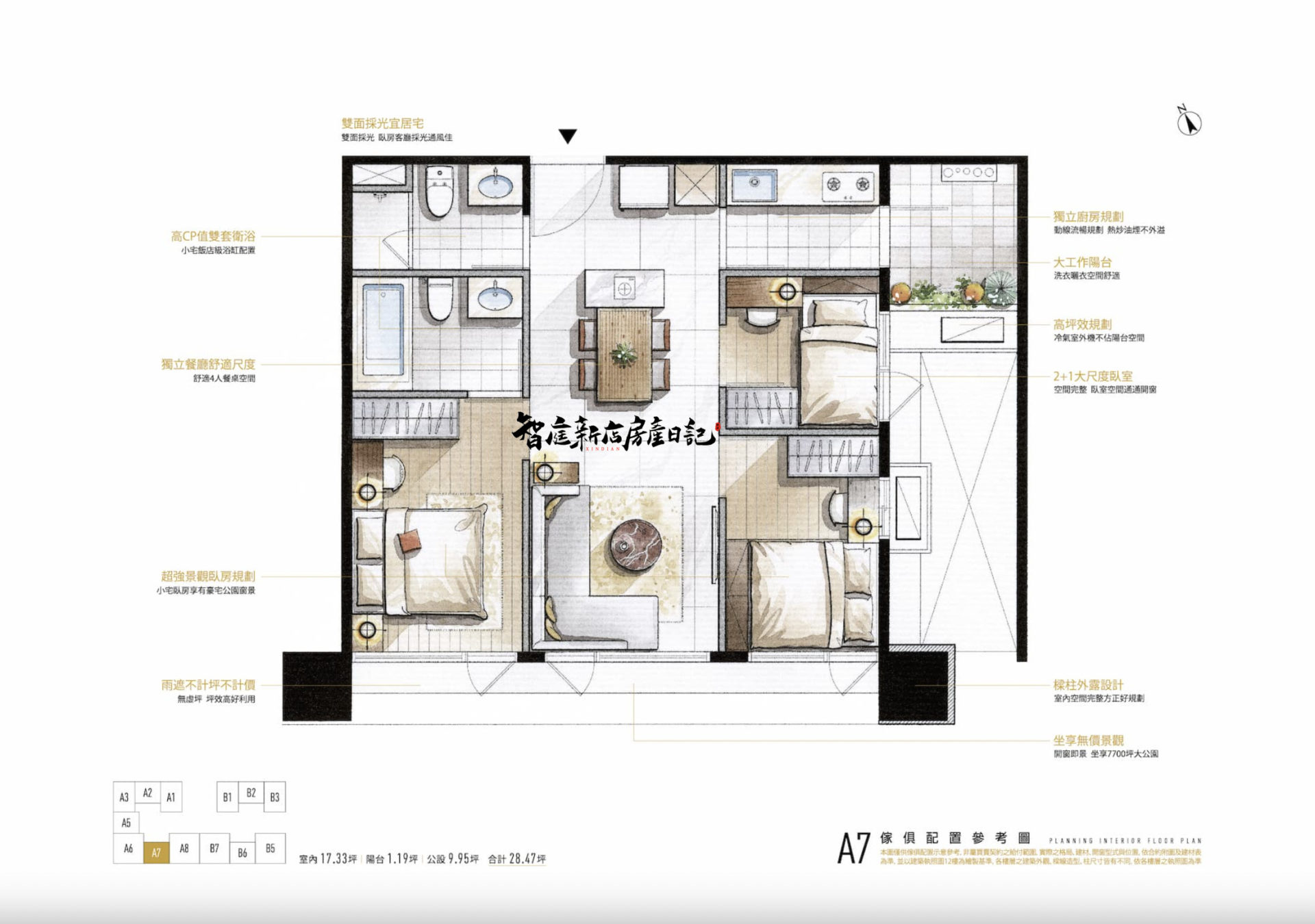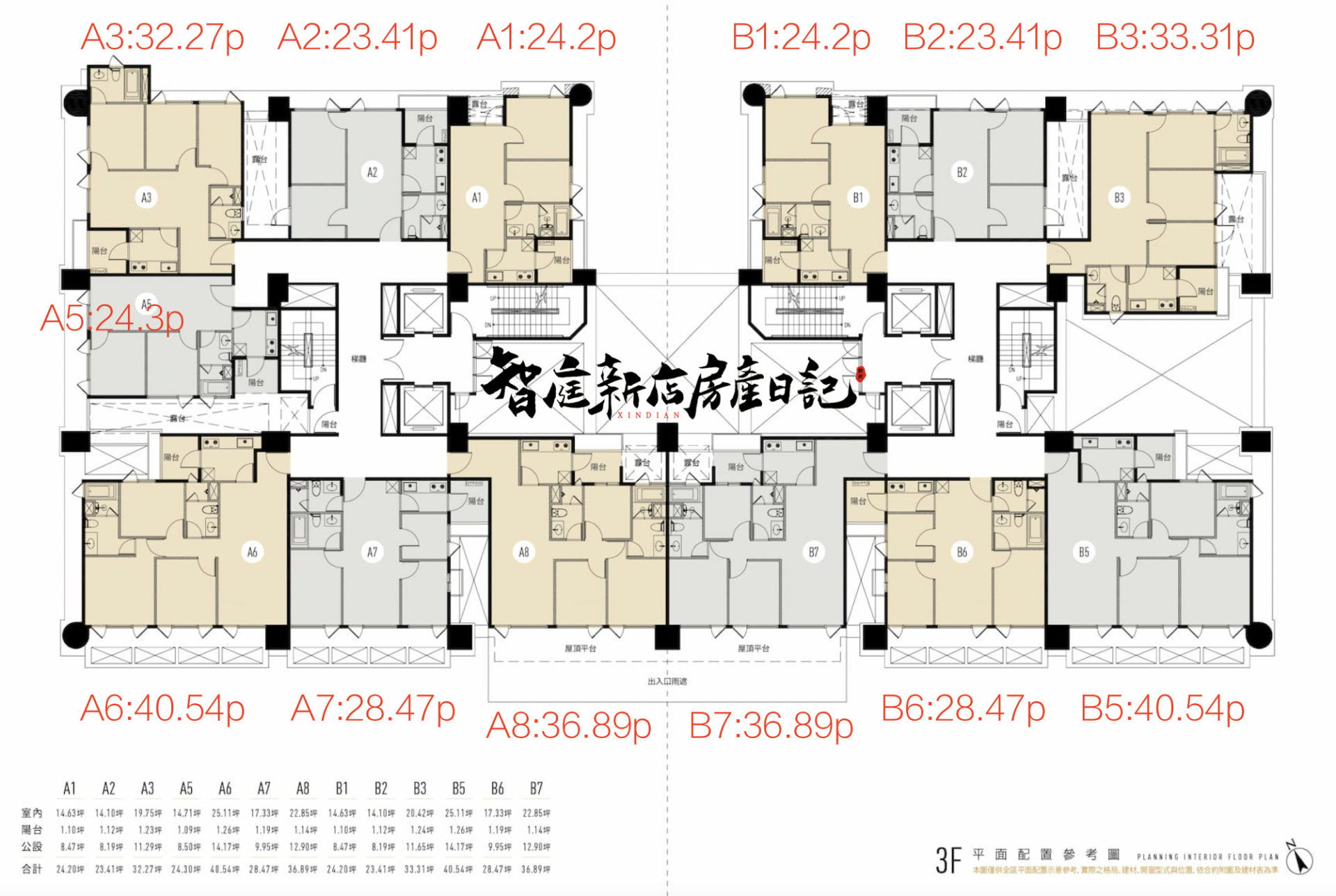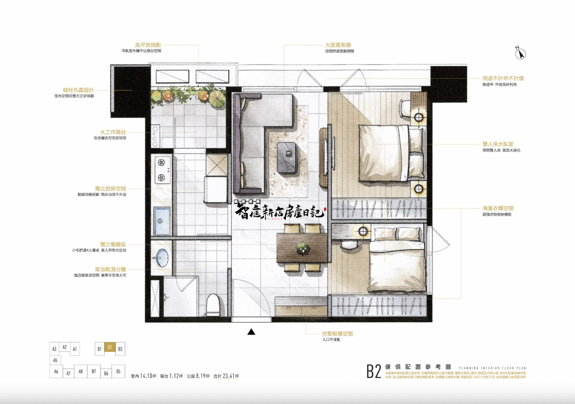 大樓區住宅單位規劃權狀約23~24坪的2房、約28坪的2+1房及約32~40坪的3房數種房型,室內高度拉到3米6,其中A6~A8、B5~B7這6戶,享有完整無遮蔽的十四張歷史公園首排景觀,產品屬性較為特殊;另外,28坪(含)以上的單位,均配置兩套衛浴系統。
