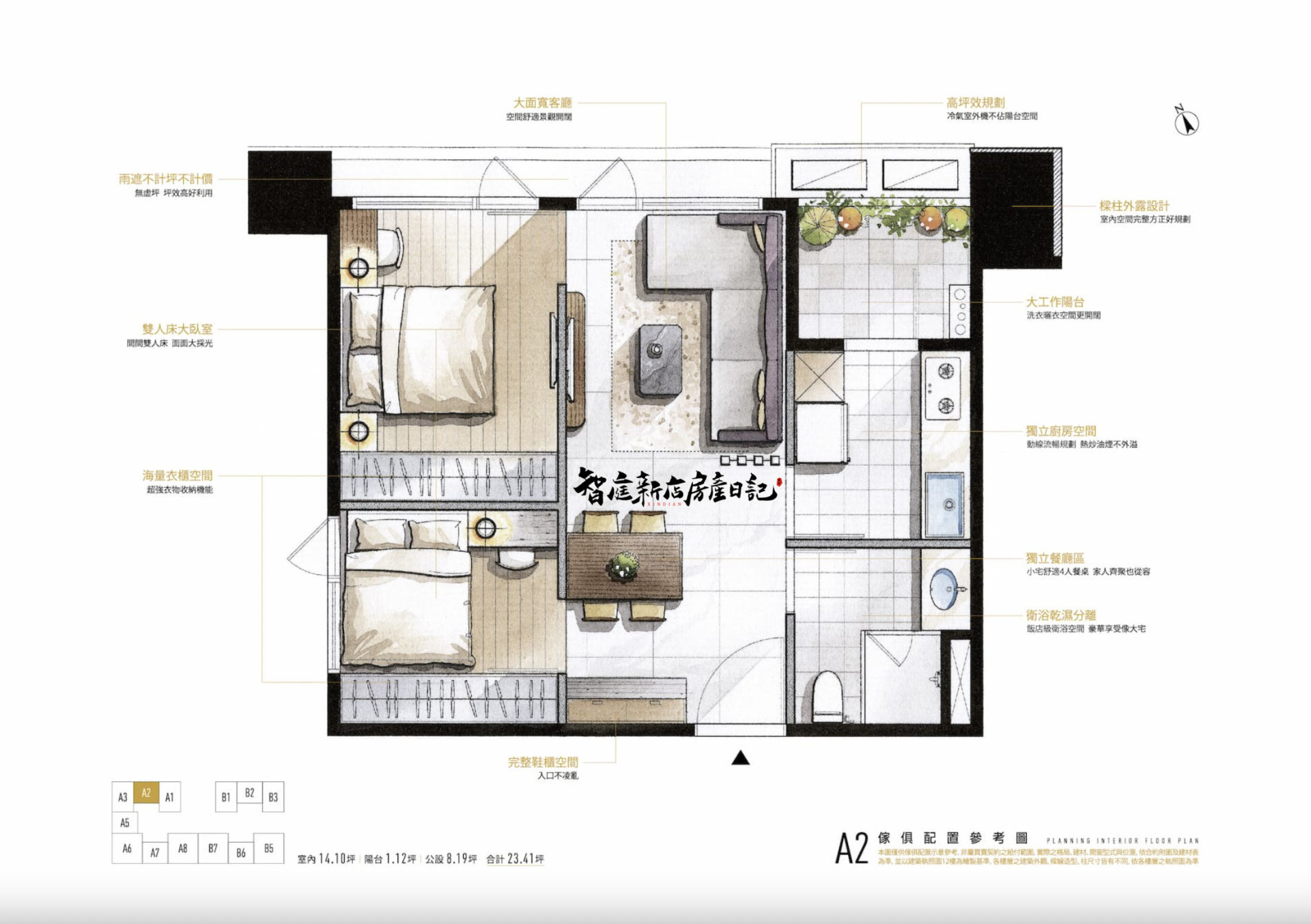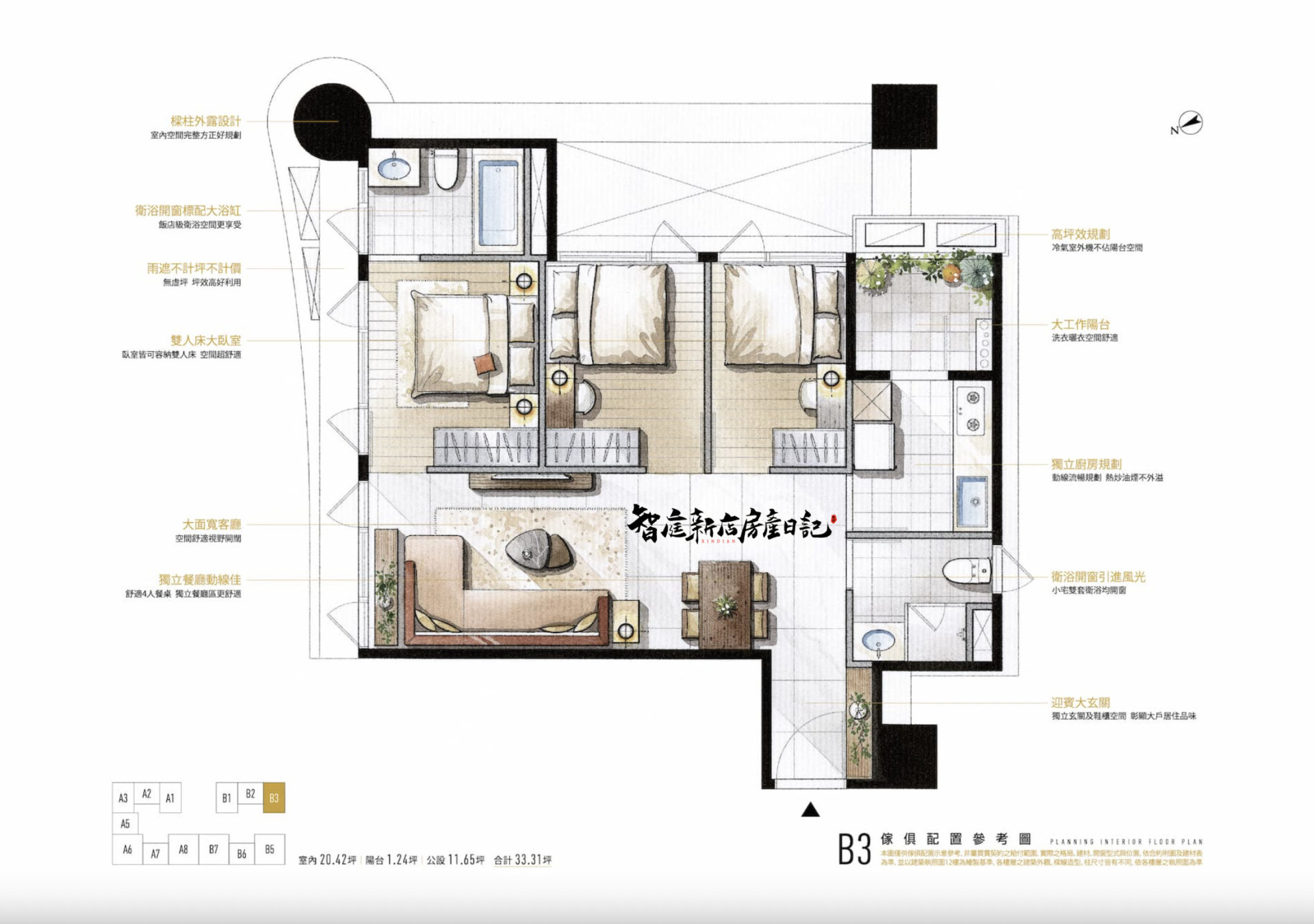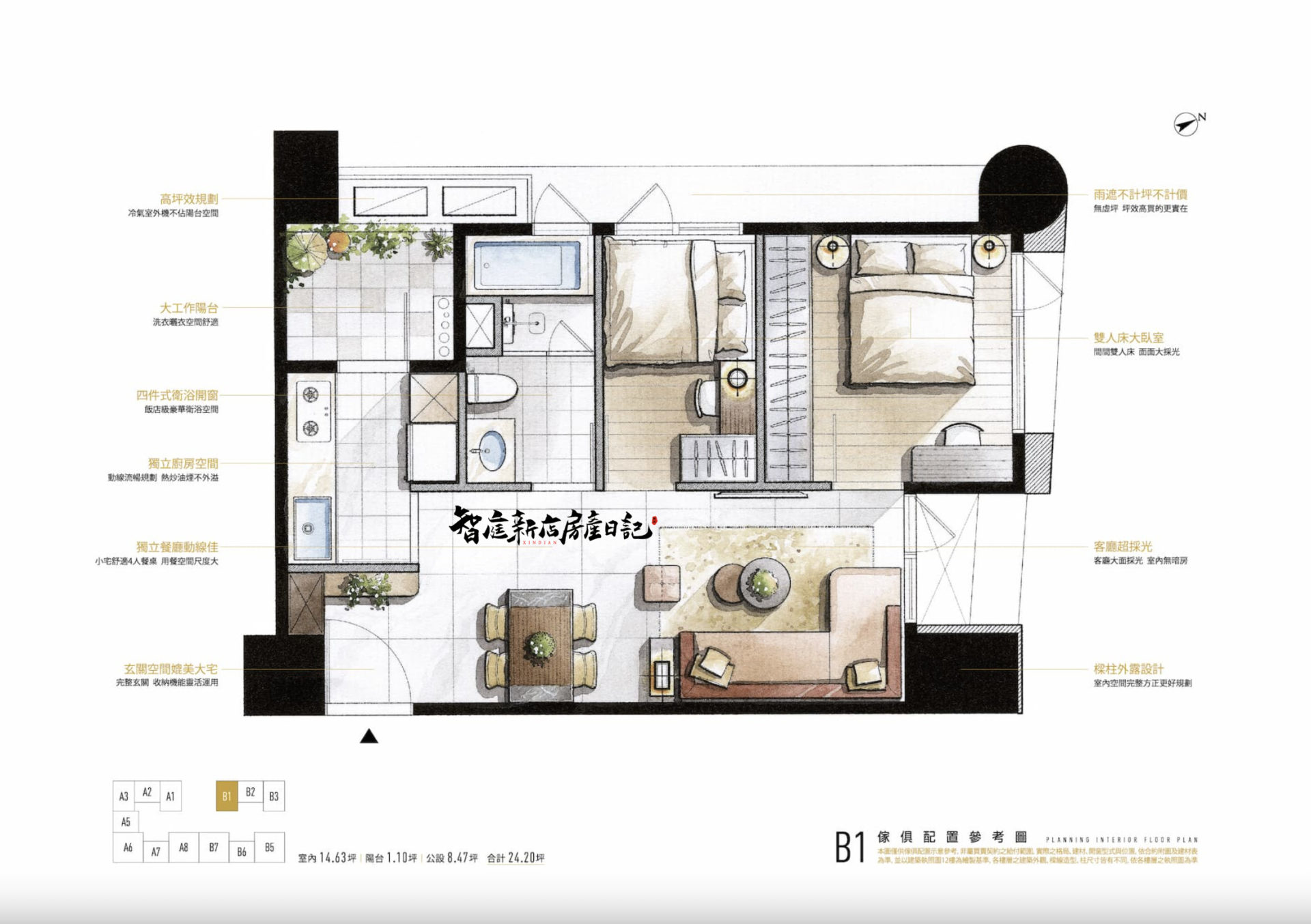 大樓區住宅單位規劃權狀約23~24坪的2房、約28坪的2+1房及約32~40坪的3房數種房型,室內高度拉到3米6,其中A6~A8、B5~B7這6戶,享有完整無遮蔽的十四張歷史公園首排景觀,產品屬性較為特殊;另外,28坪(含)以上的單位,均配置兩套衛浴系統。
