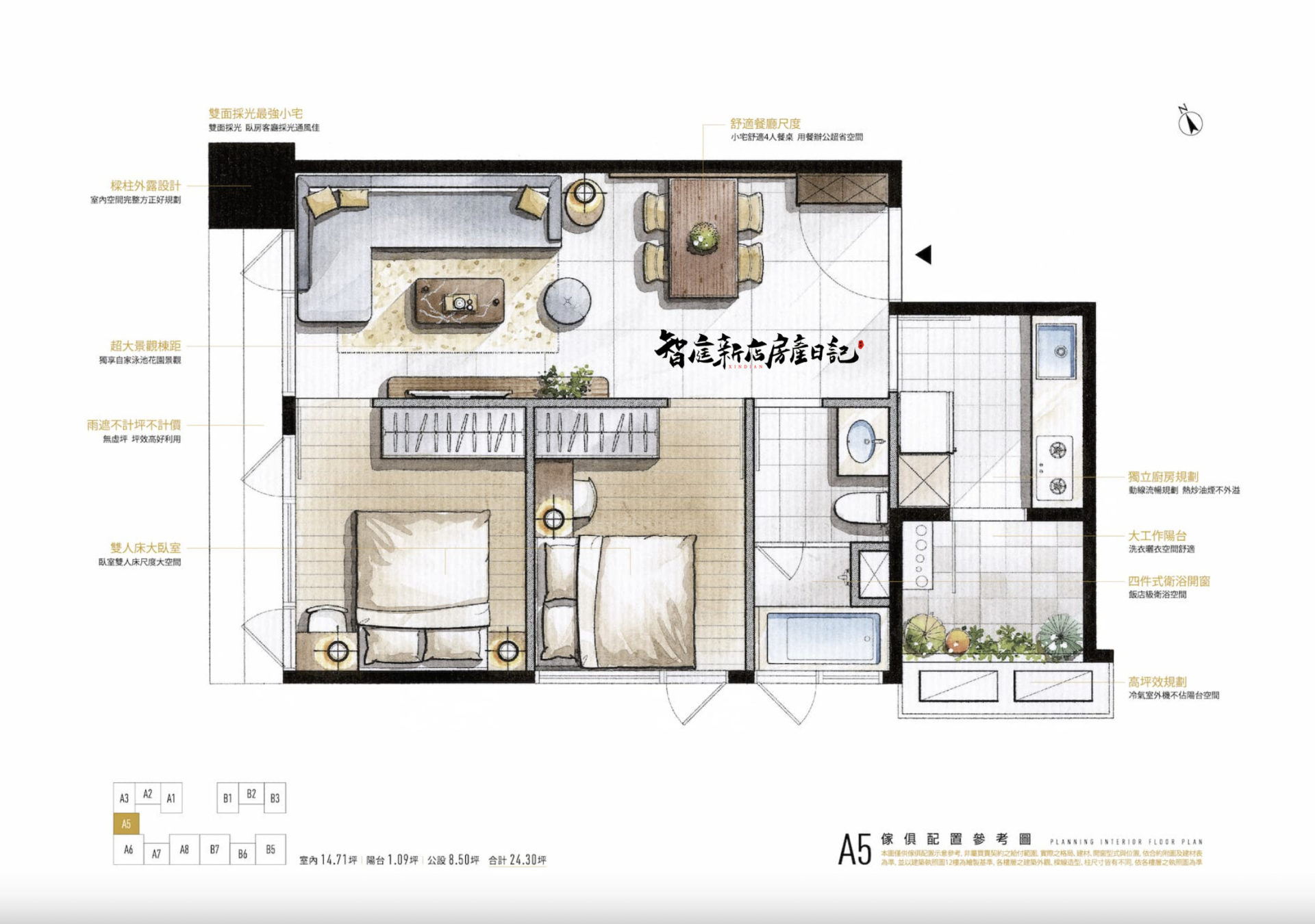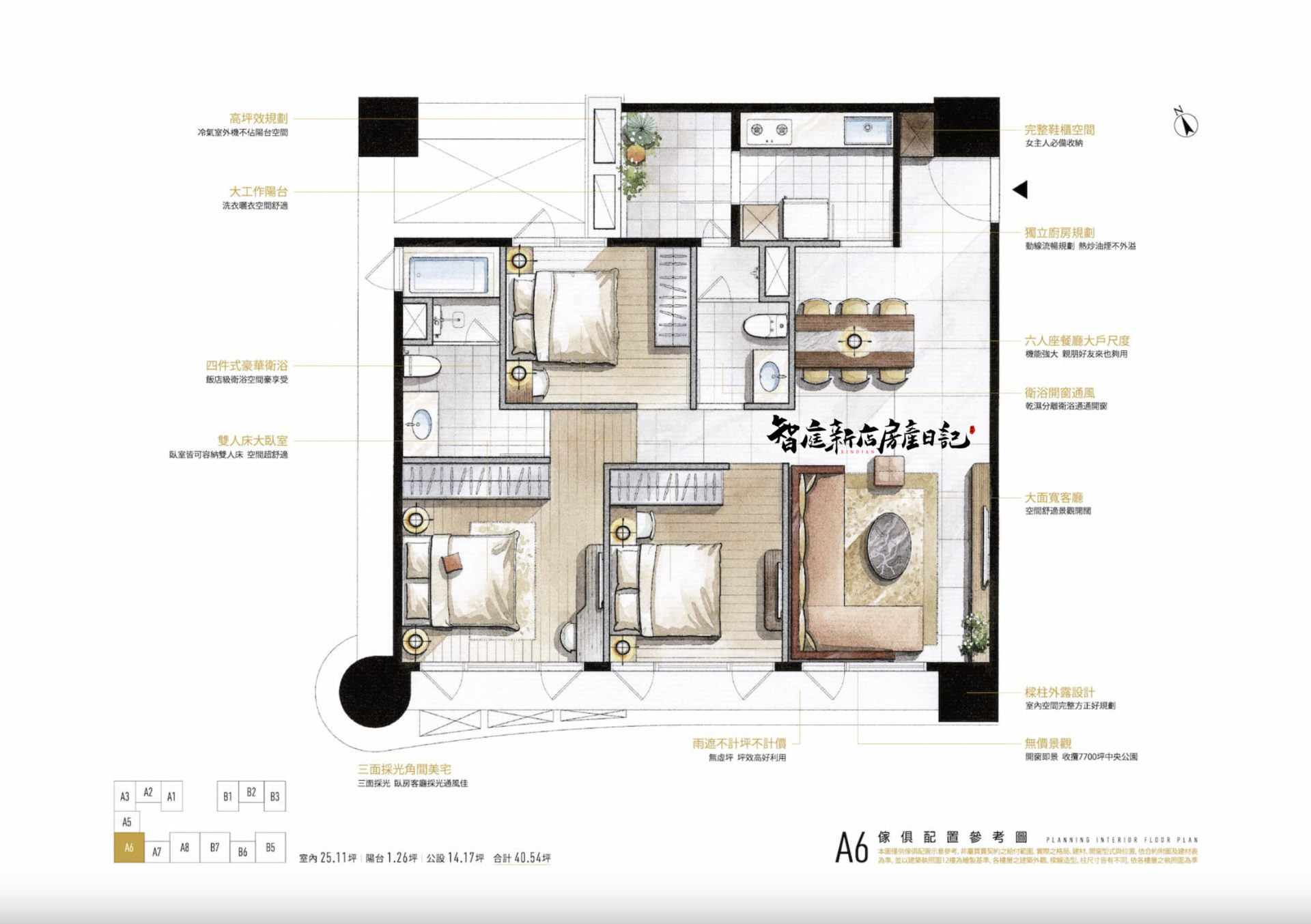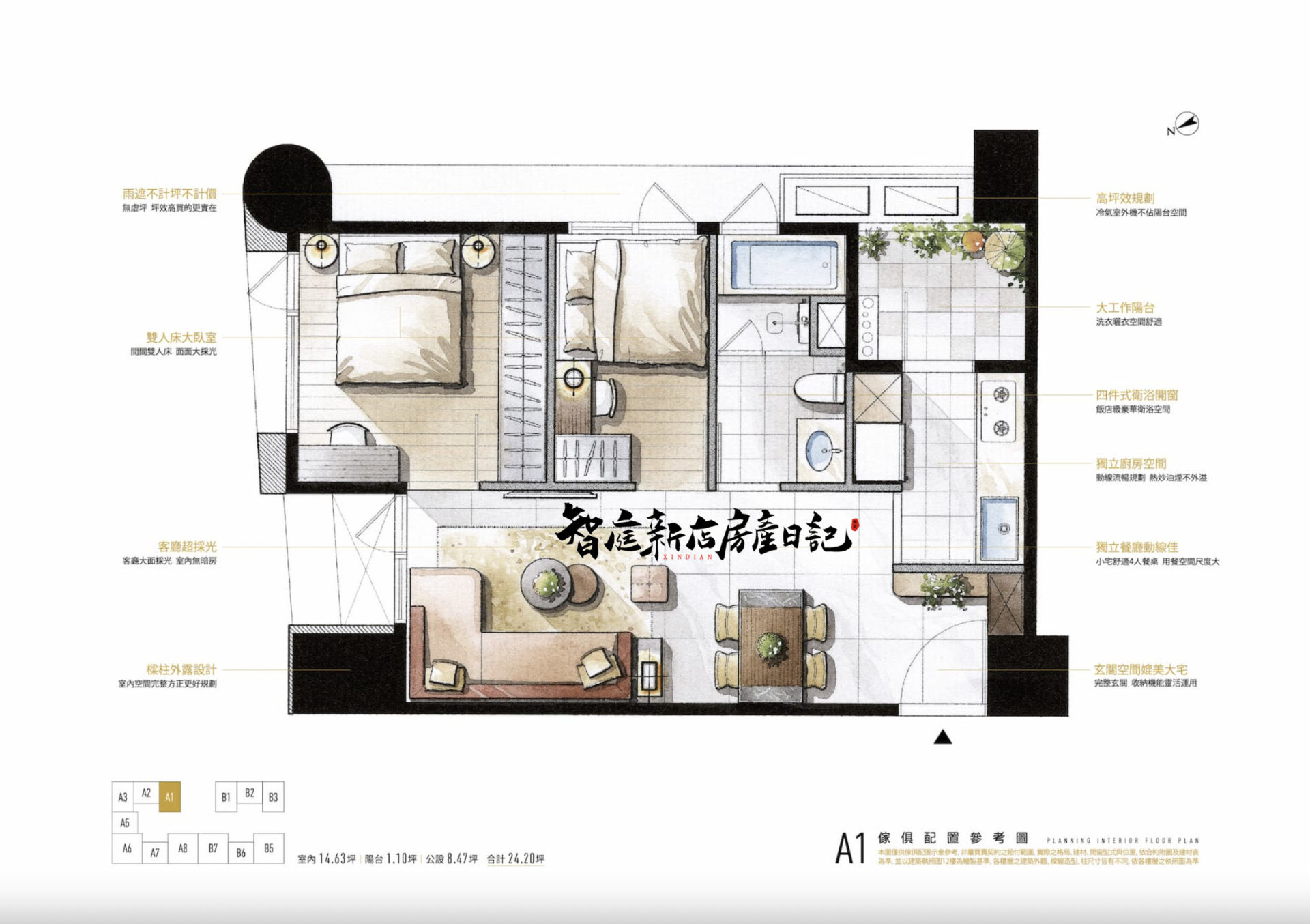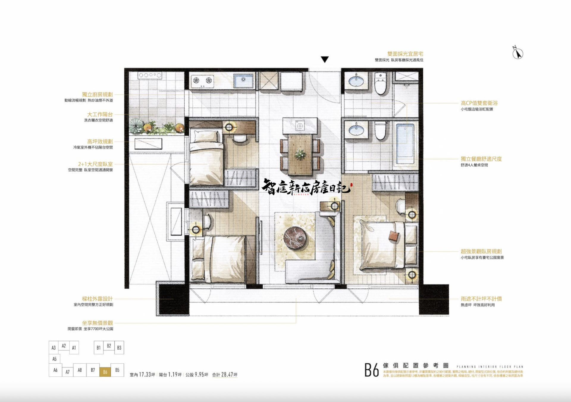 標準建材附有80x80cm冠軍拋光石英磚或木地板(住戶可自由選擇)、Dormakaba電子鎖、6+6mm Low-E玻璃、日本三協氣密窗、大雅廚具、林內瓦斯爐、抽油煙機及電器櫃、義大利Glem Gas蒸氣烤箱、日本Inax衛浴系統(主衛配智慧型馬桶)、三菱多功能暖風機、樂奇新風機、電動曬衣架、當層排氣系統等;現場採不二價銷售,每坪售價66~72萬元,預計2026年上半年可交屋。