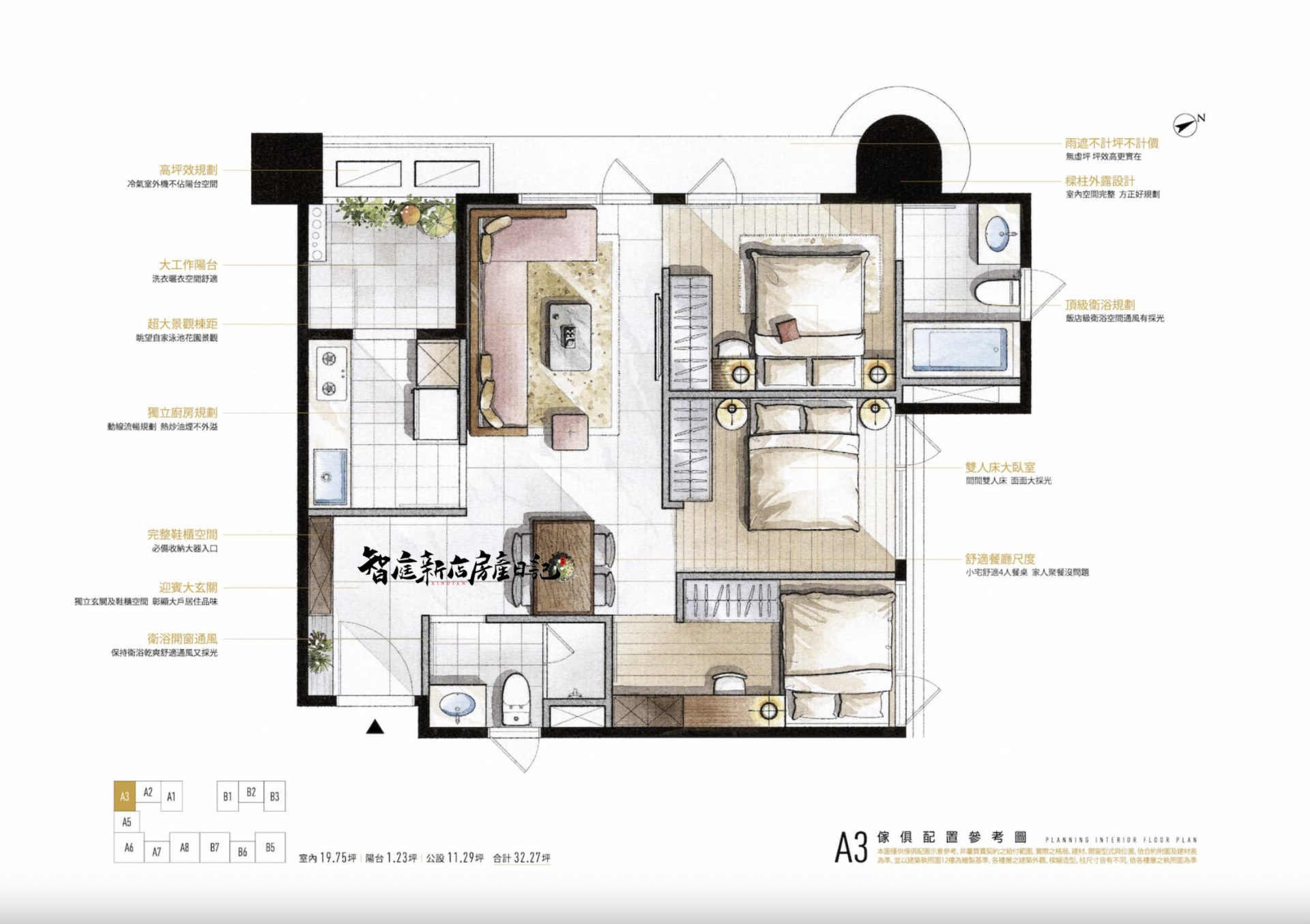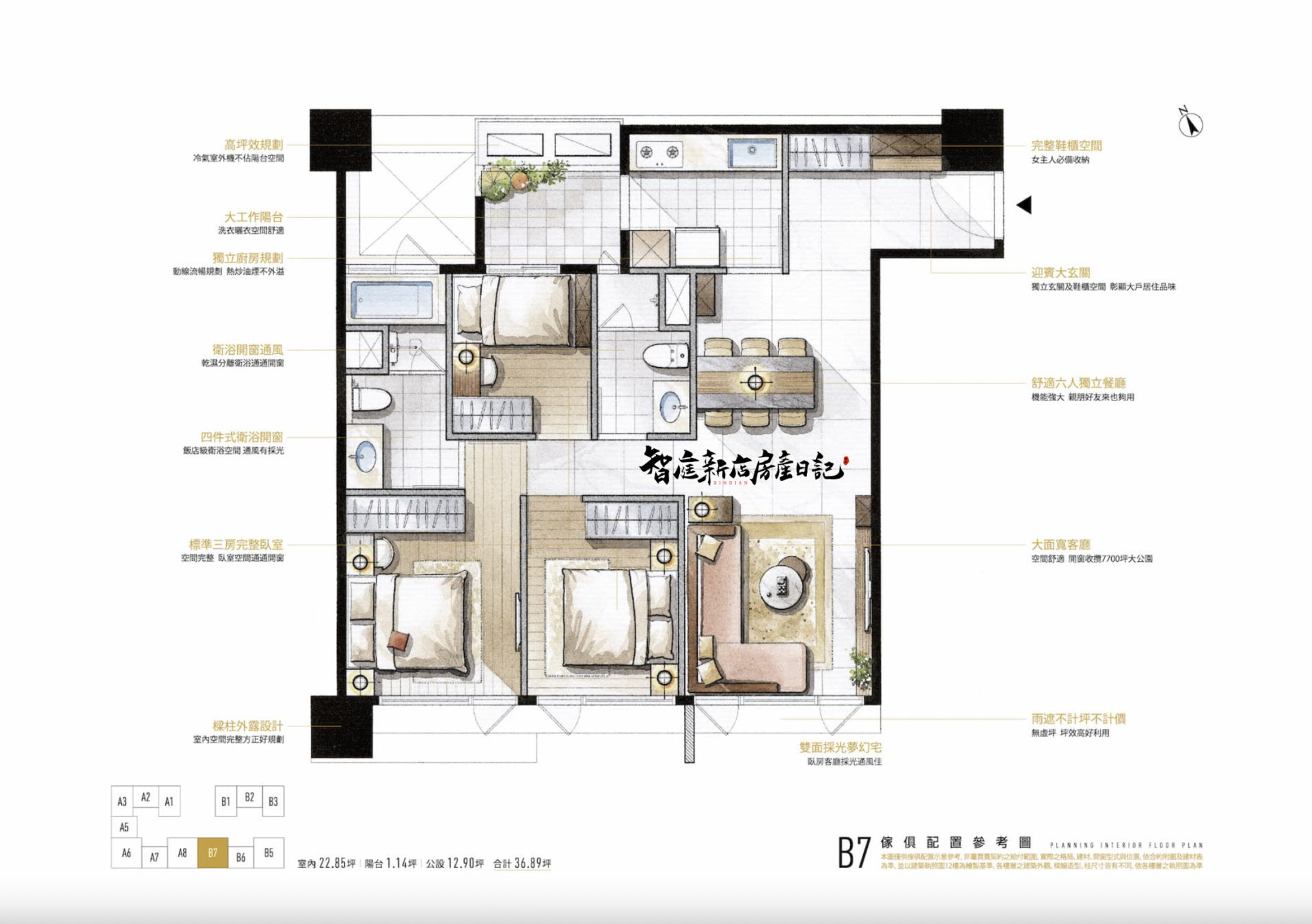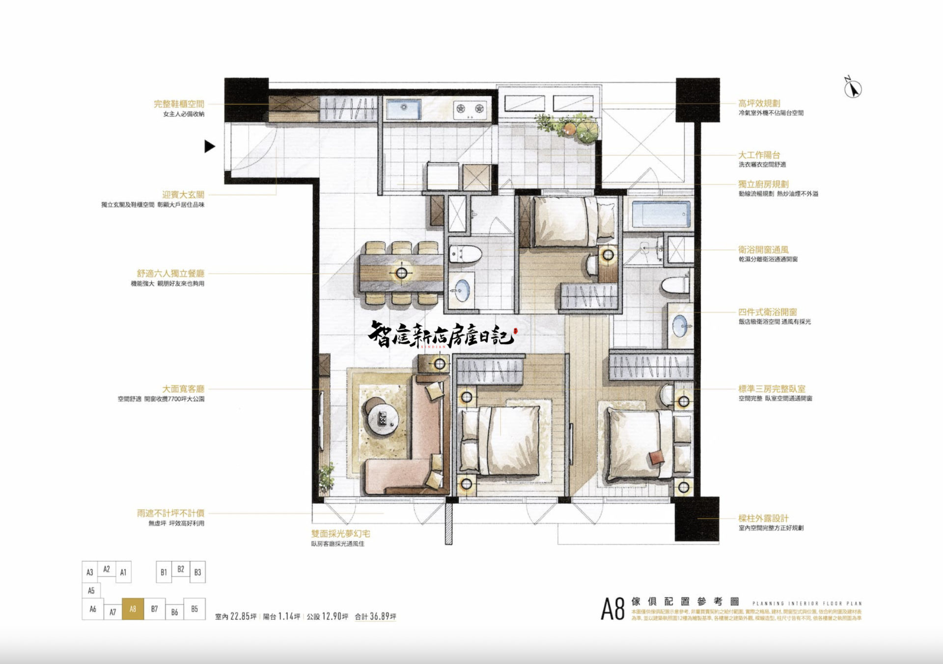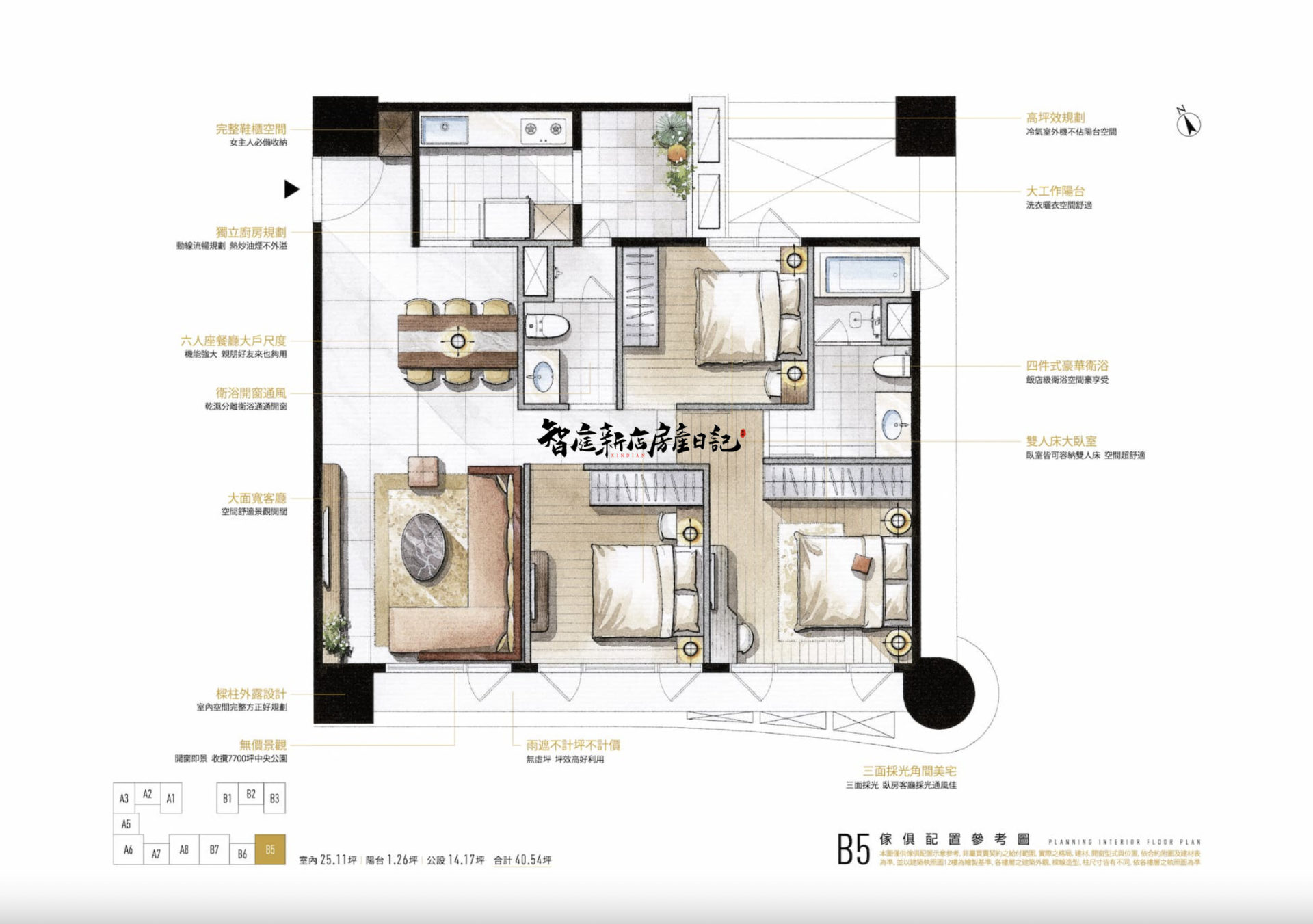 標準建材附有80x80cm冠軍拋光石英磚或木地板(住戶可自由選擇)、Dormakaba電子鎖、6+6mm Low-E玻璃、日本三協氣密窗、大雅廚具、林內瓦斯爐、抽油煙機及電器櫃、義大利Glem Gas蒸氣烤箱、日本Inax衛浴系統(主衛配智慧型馬桶)、三菱多功能暖風機、樂奇新風機、電動曬衣架、當層排氣系統等;現場採不二價銷售,每坪售價66~72萬元,預計2026年上半年可交屋。
