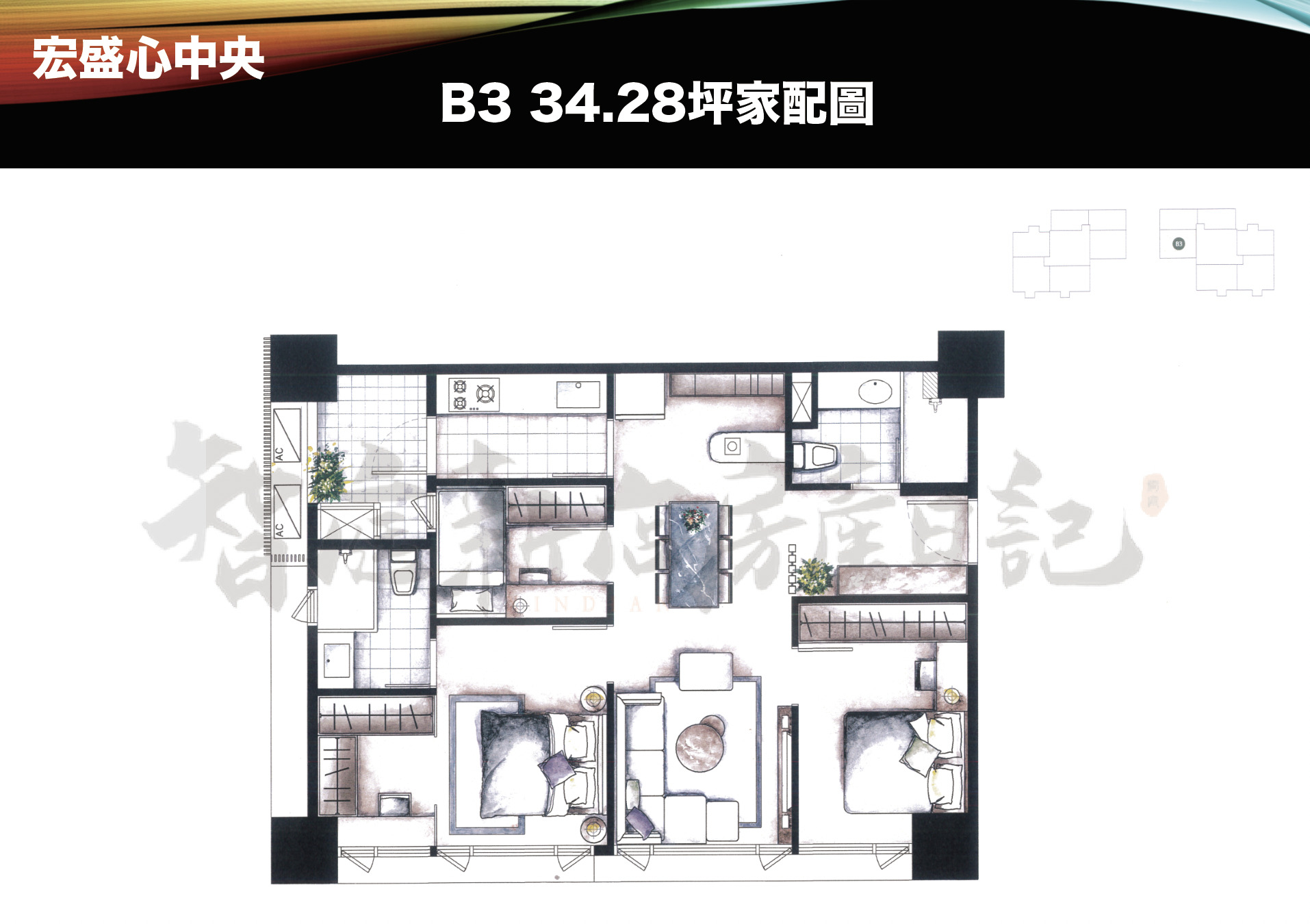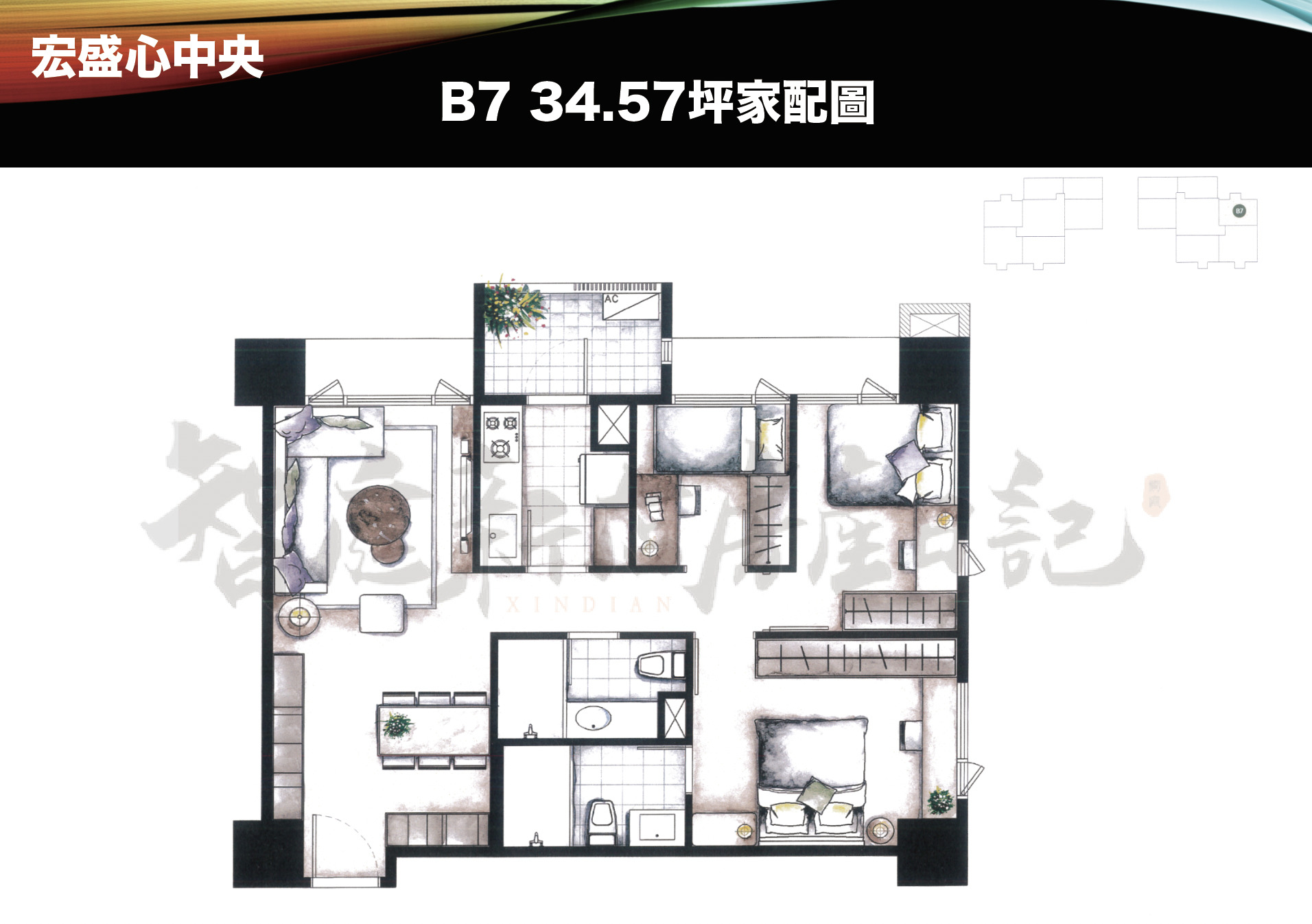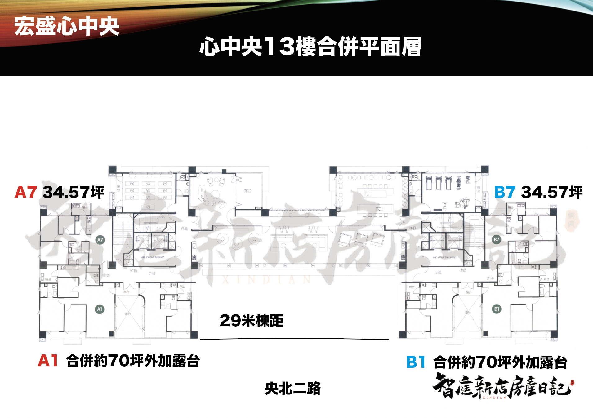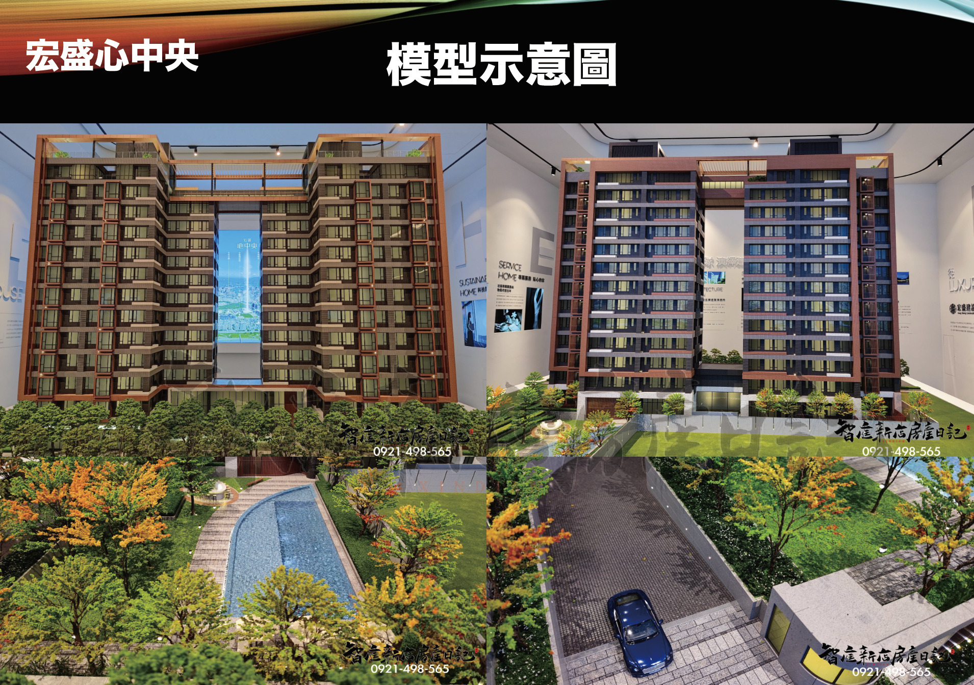 宏盛心中央,建商宏盛建設,知名建案:宏盛帝寶,宏盛新中央基地為1142坪,樓高13F,地下B3F,社區大廳挑高為7米8,其他樓層皆為3米6,住家戶數137戶,店面4戶,車位數131個平面車位(全數車位都幫你拉好充電線),車位清潔費為800元,管理費暫定90元/坪,社區管理代管5年,5年管理費都由宏盛建設幫你負擔,綠建築:黃金級,公設比34.8%,建蔽率30.49%。規劃為兩棟建築,A棟靠近遠雄青青,B棟靠近斯馨路,都是為一層六戶鏡相規劃,室內高度3米6,樓地板厚度15cm,規劃坪數 兩房25、26坪,三房規劃34、37、43坪,13樓為合併戶A1、B1更變約70多坪另配露台,則A7、B7坪數不變34坪,A1、A2、B1、B2看國小預定地(現在為文教預定地,預計會為雙語學校、如人數不夠會改為圖書館其他相關)。