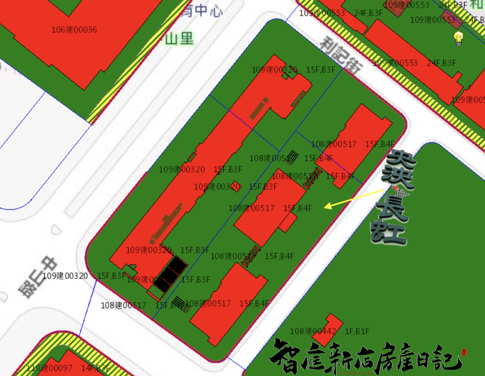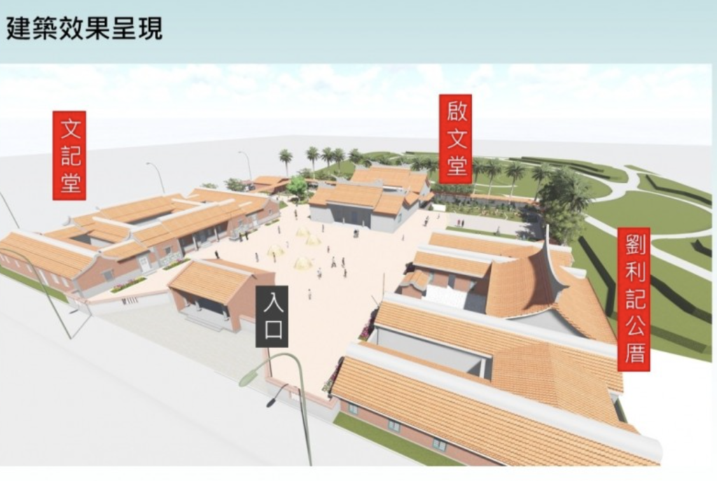 央泱長虹正面中央公園也面劉氏家廟、利記公厝、劉氏文記堂都已經被新北市登錄為歷史古蹟,下方有劉氏古厝跟央泱長虹對照示意圖。